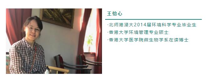 王怡心于2014年毕业于UIC环境科学专业,后赴香港大学就读环境管理硕士课程。在UIC时,王怡心就初步接触了科学实验。她说,她所在的环境科学专业平时有些课题需要自己设计实验。大四时,她的毕业研究课题是用一种细菌测水中的铜含量,那时就接触到了细胞培养。她还在环境科学实验室担任助理,“从那时起,我就对科研有了一个初步的、启蒙的感觉。”