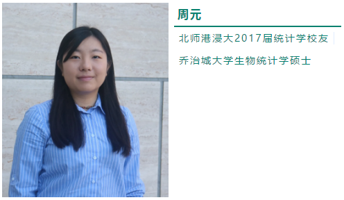 周元于UIC毕业后进入美国乔治城大学生物统计学专业深造,硕士毕业后就职于加利福尼亚大学旧金山分校,主要工作是利用统计学的方法研究基础生物学相关机制,根据实验获得的数据进行统计分析。
